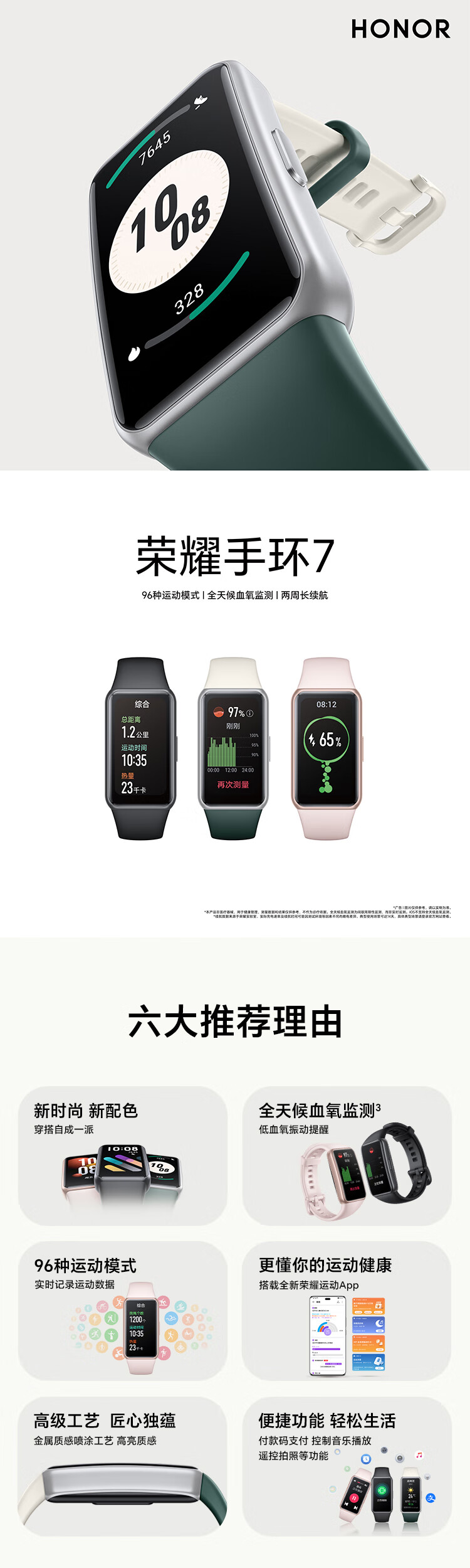 荣耀手环7 全天候血氧监测 96种运动模式 智能手环 运动手环 智能心率 50米防水 幻夜黑